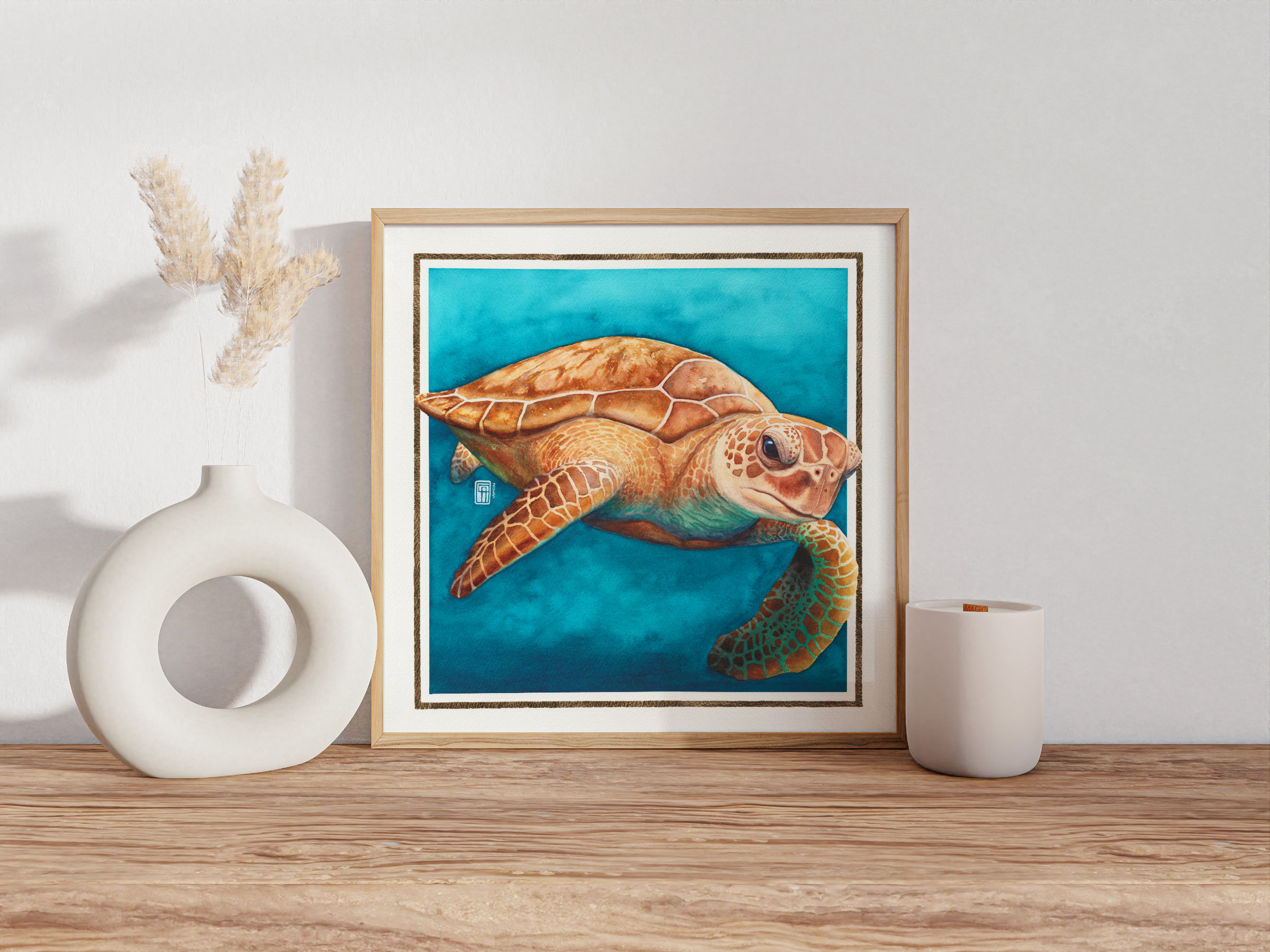 Aquarellgemälde einer Meeresschildkröte auf Okinawa mit Blattgoldrand im Bilderrahmen