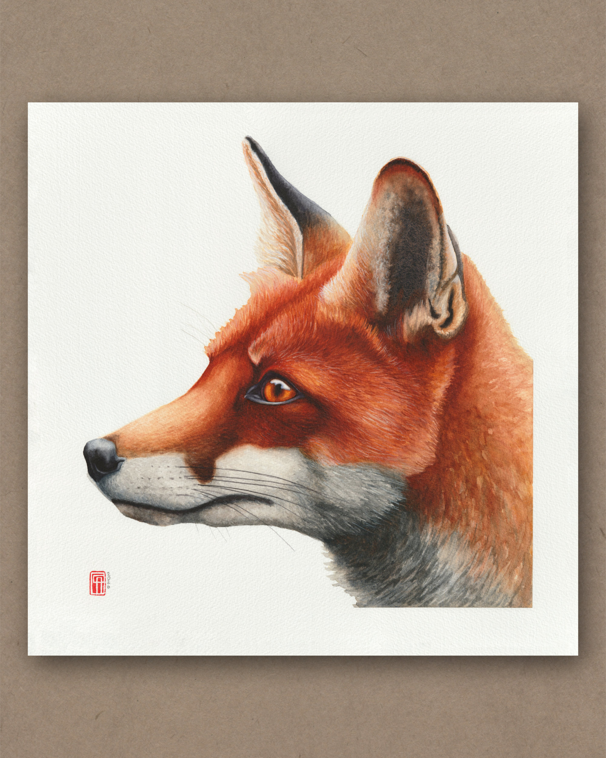 Als stiller Jäger ist der Rotfuchs ein Meister der Aufmerksamkeit. In diesem Aquarell steht nicht die Bewegung, sondern der Blick im Mittelpunkt: ruhig, lauernd, ganz im Einklang mit seiner Umgebung.