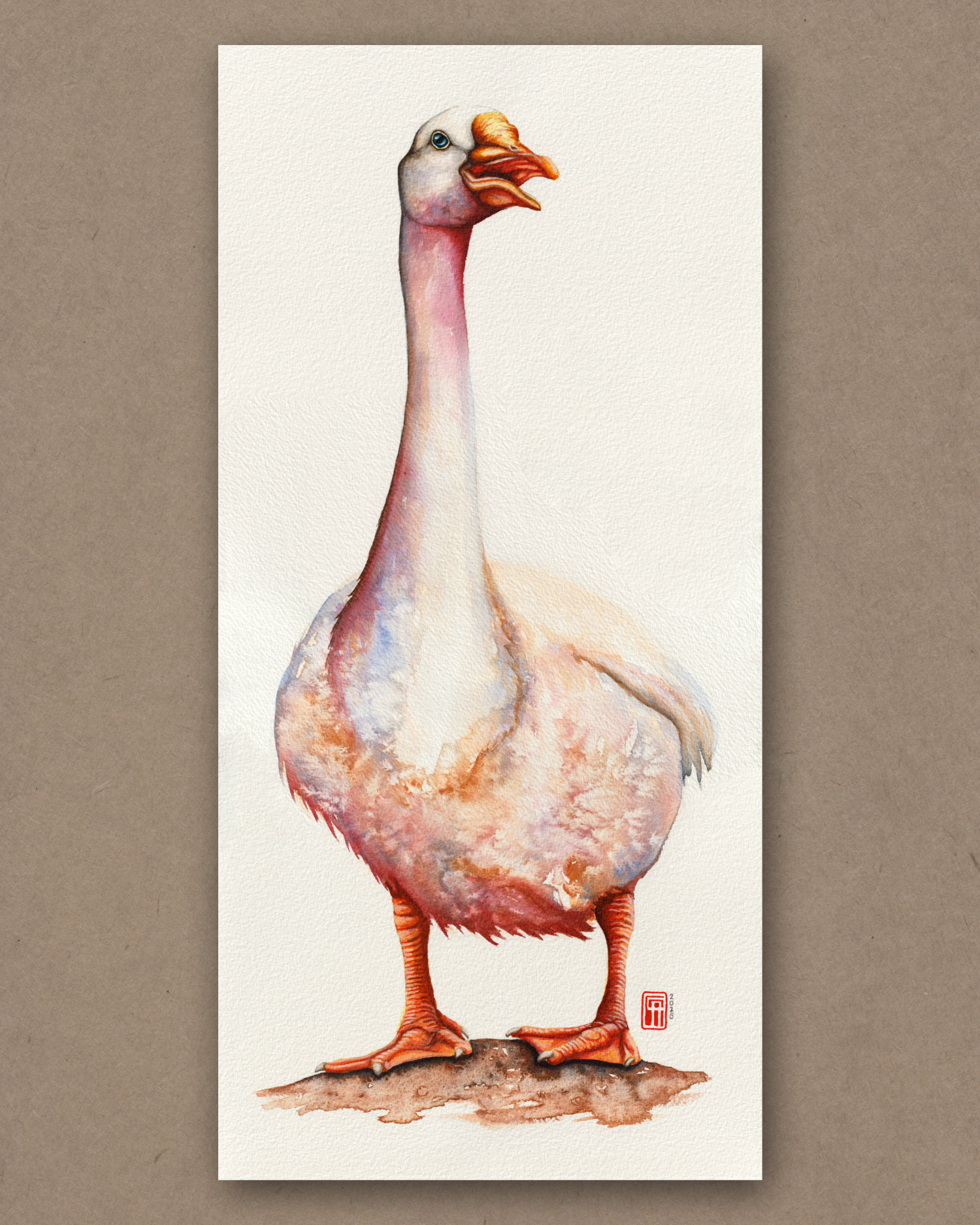 Mit ausladendem Schritt und erhobenem Kopf kommt die Gans meckernd auf den Betrachter zu – wachsam, selbstbewusst und bereit, ihr Revier mit Nachdruck zu verteidigen.