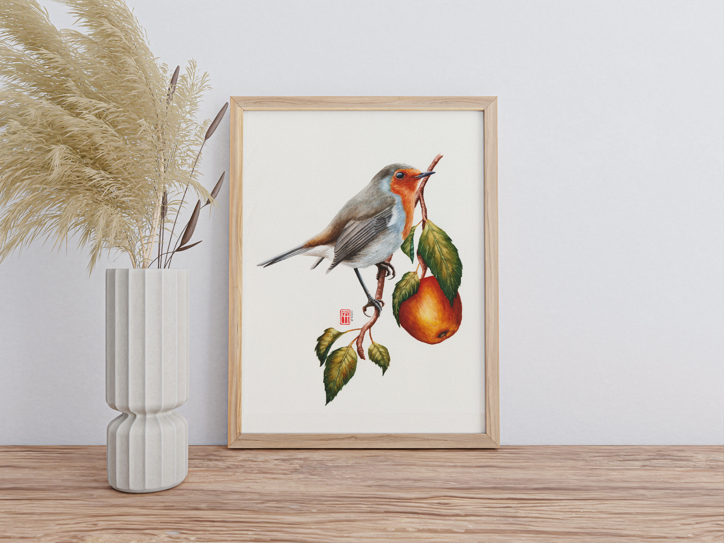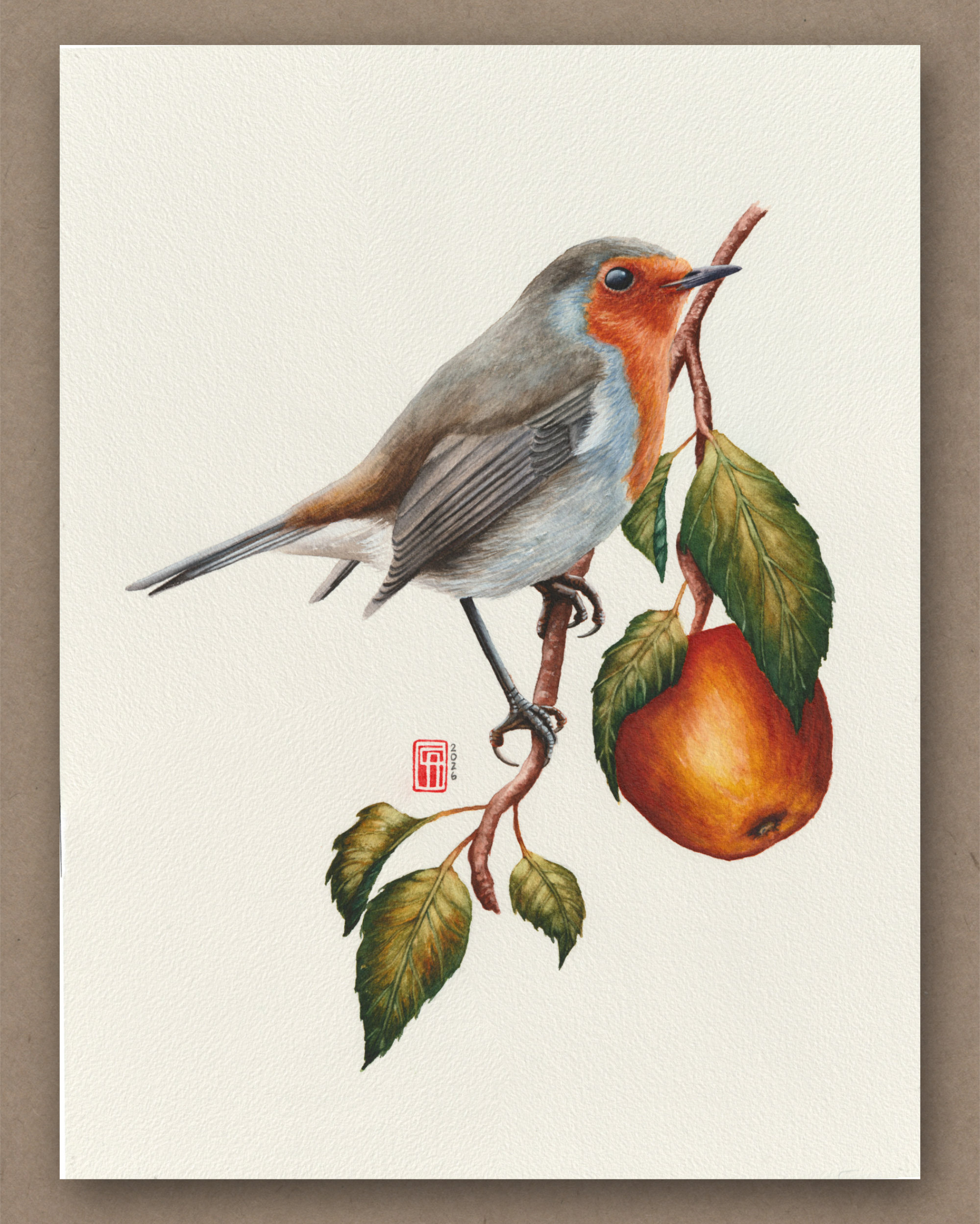Zwischen reifenden Äpfeln ruht das Rotkehlchen auf einem Zweig. Sein leiser Gesang begleitet die warmen Tage des Spätsommers, wenn Licht und Zeit langsamer werden. Das Aquarell hält diesen stillen Moment im Obstgarten fest.